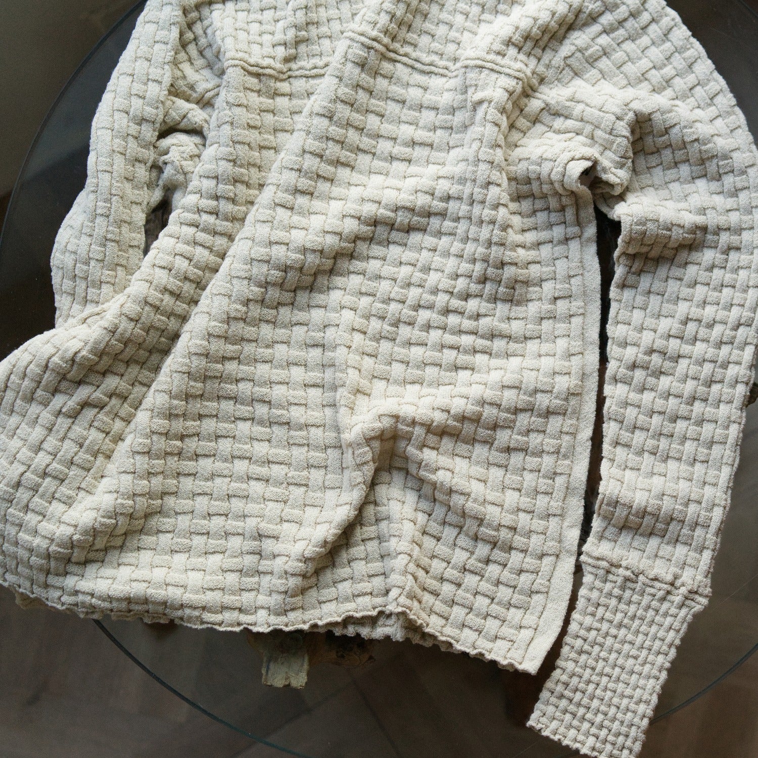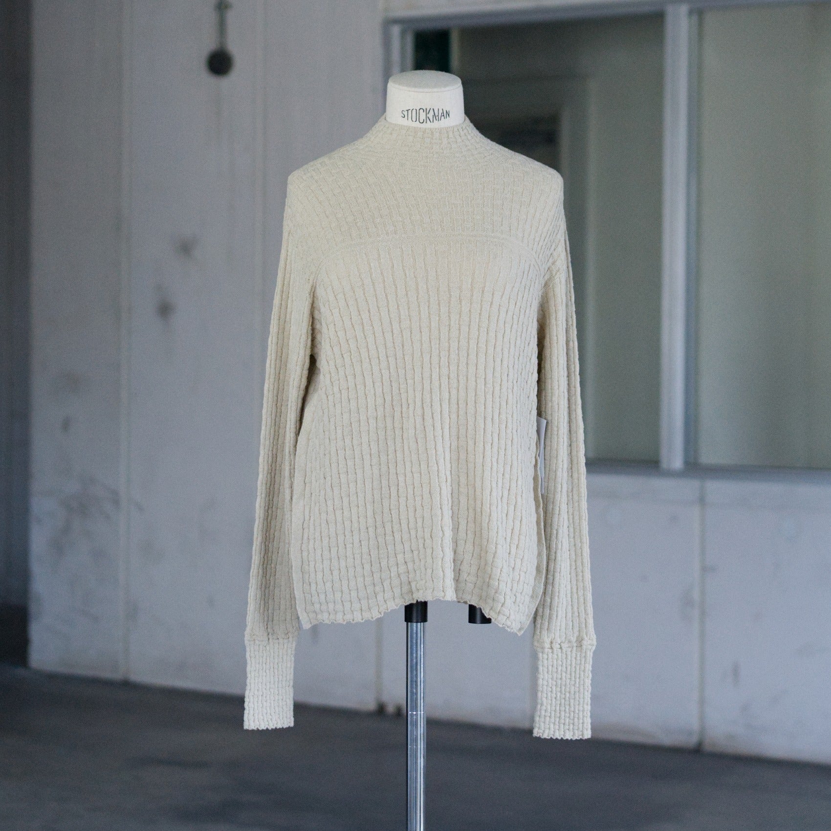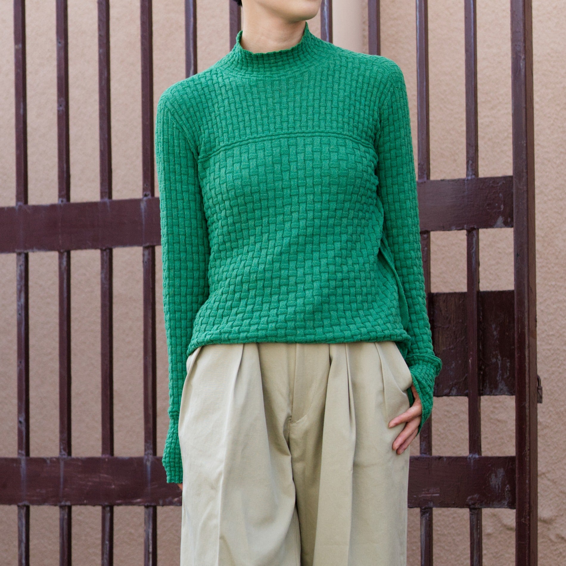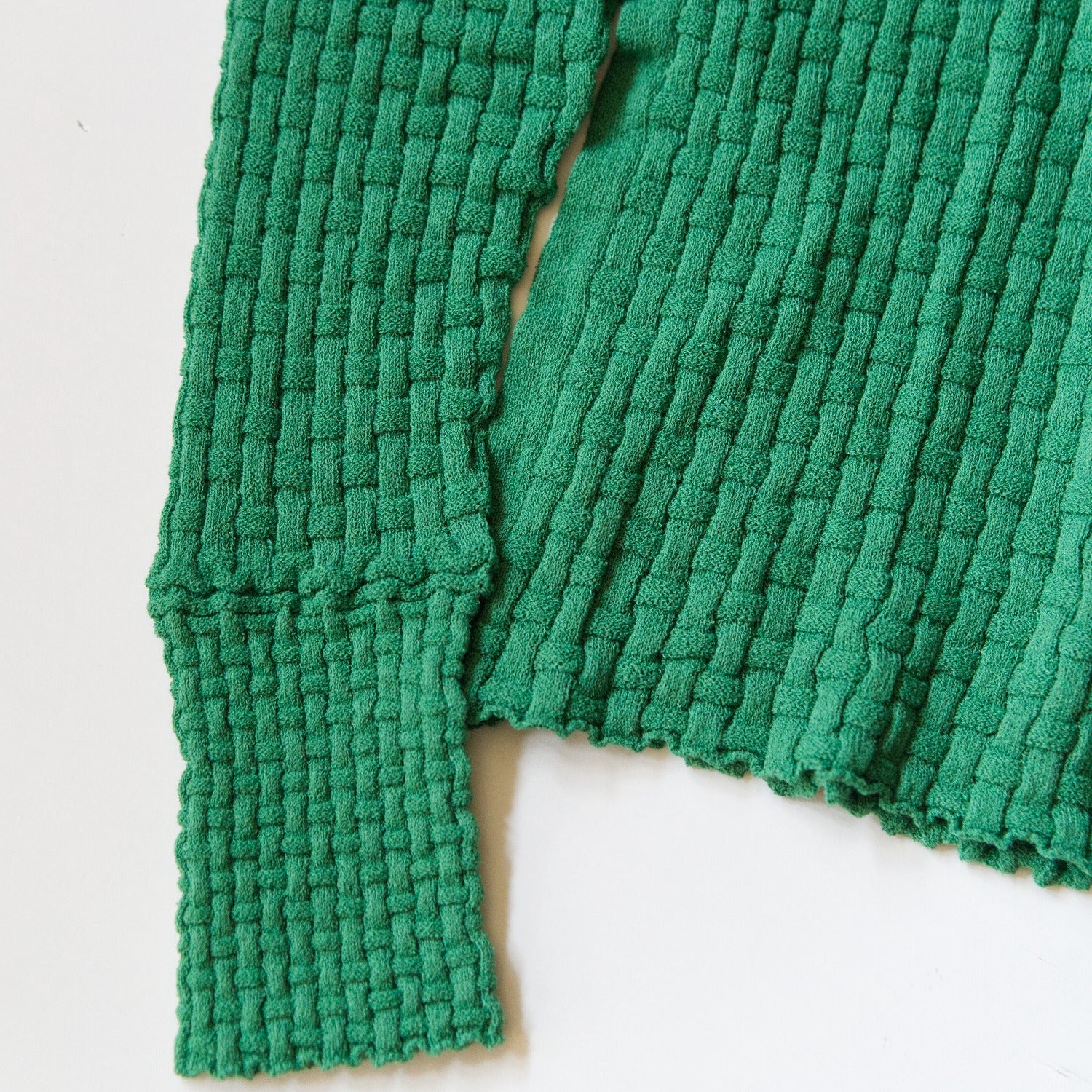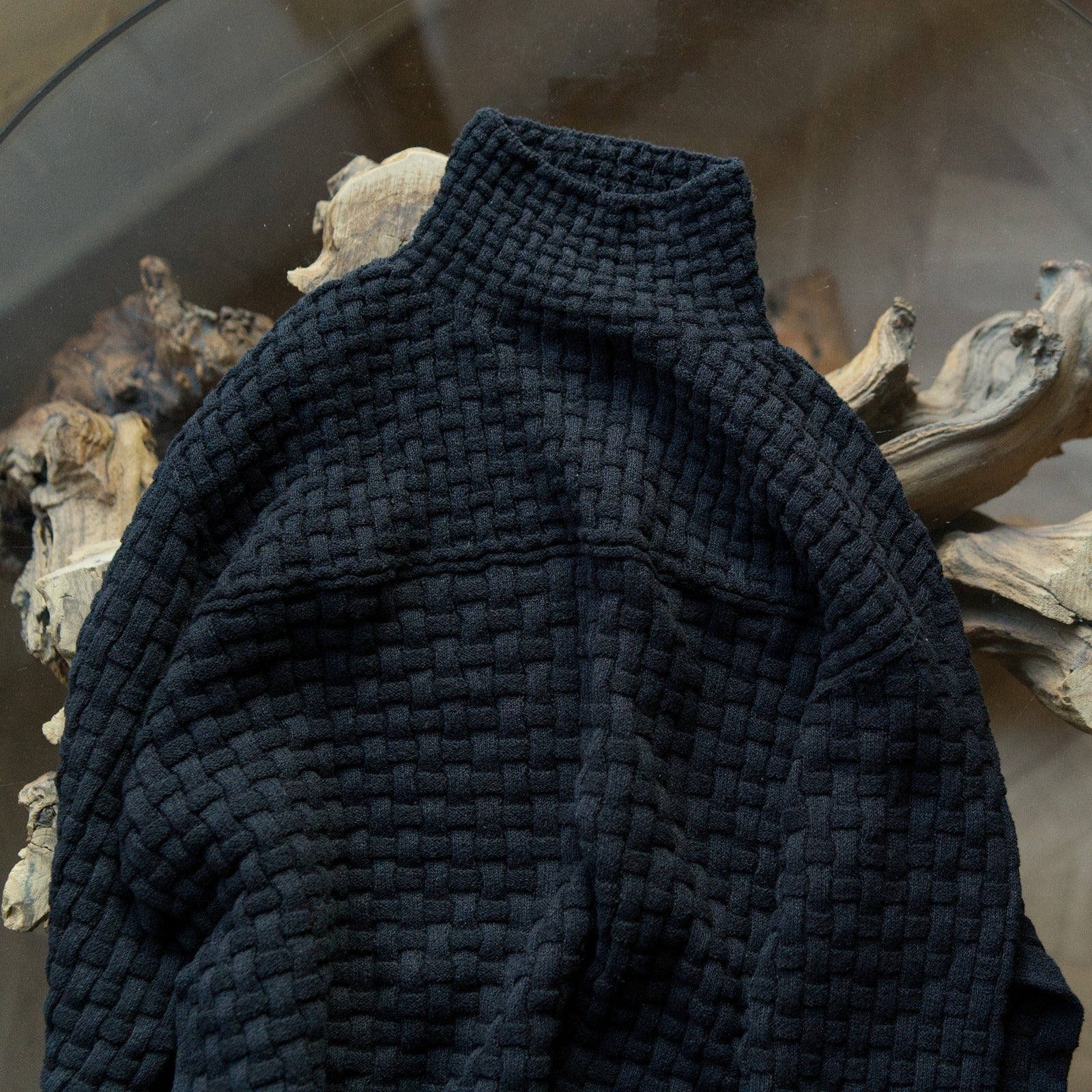 籠模様をイメージした立体的な編み柄をホールガーメント機で編みあげられたニット。