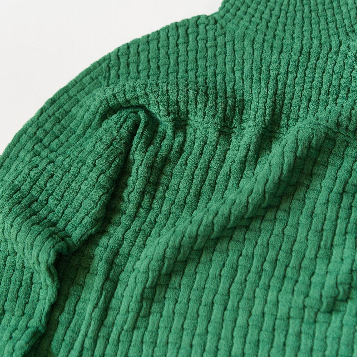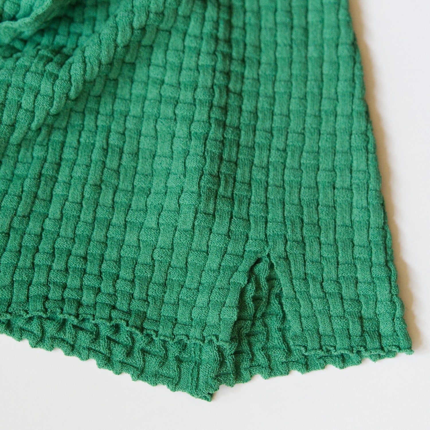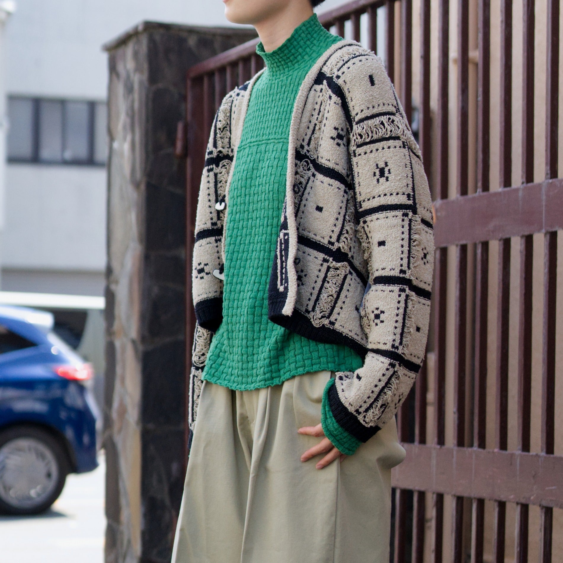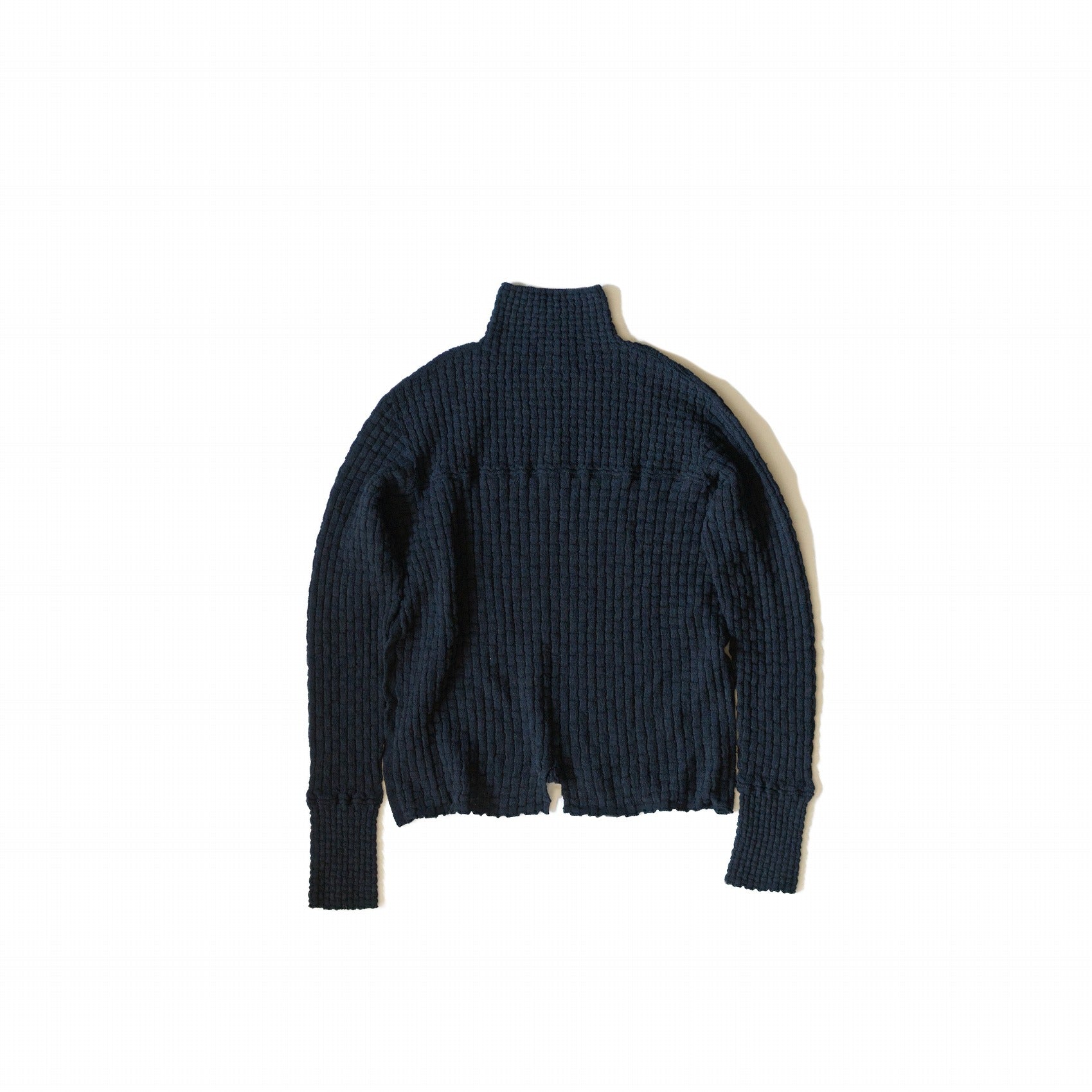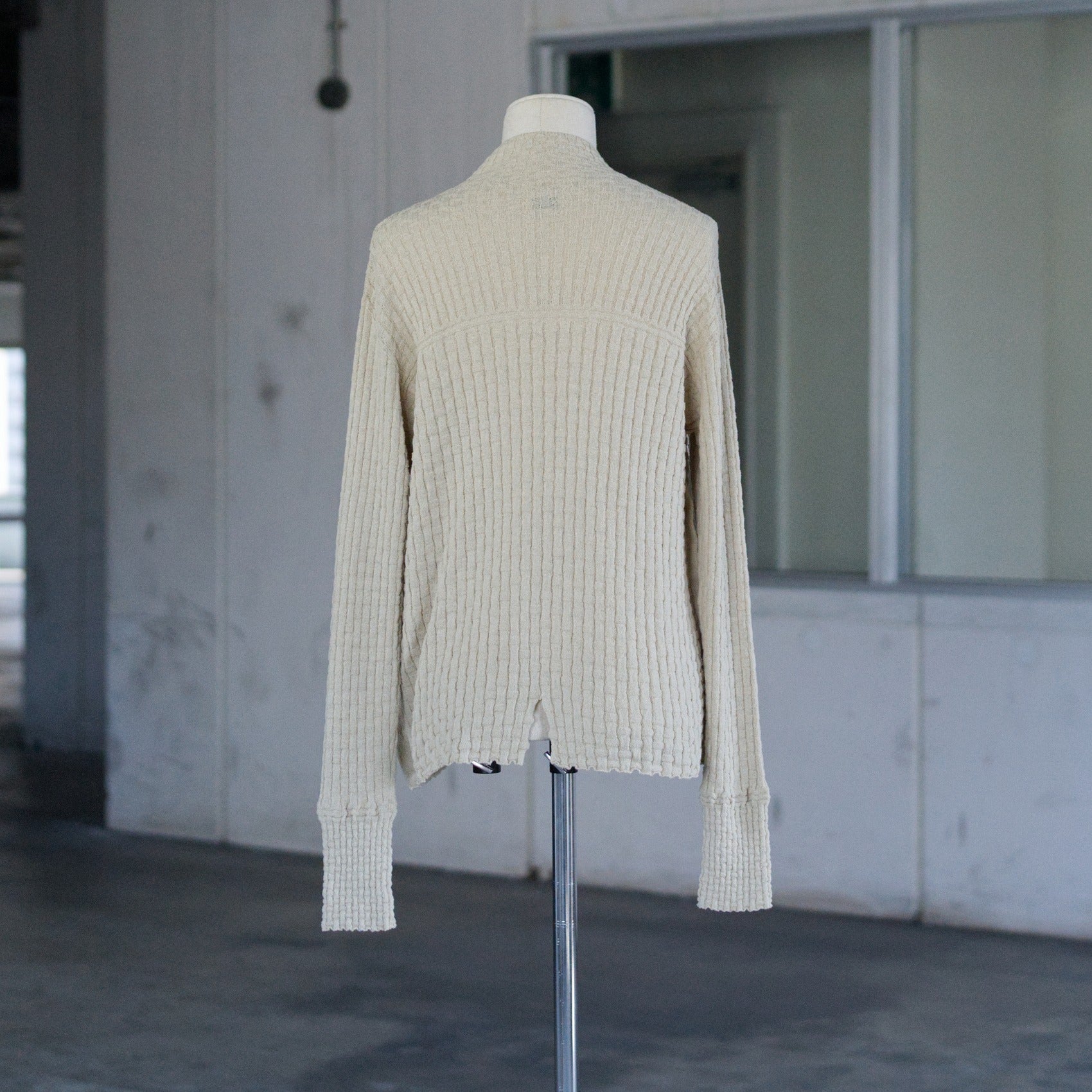 籠模様をイメージした立体的な編み柄をホールガーメント機で編みあげられたニット。