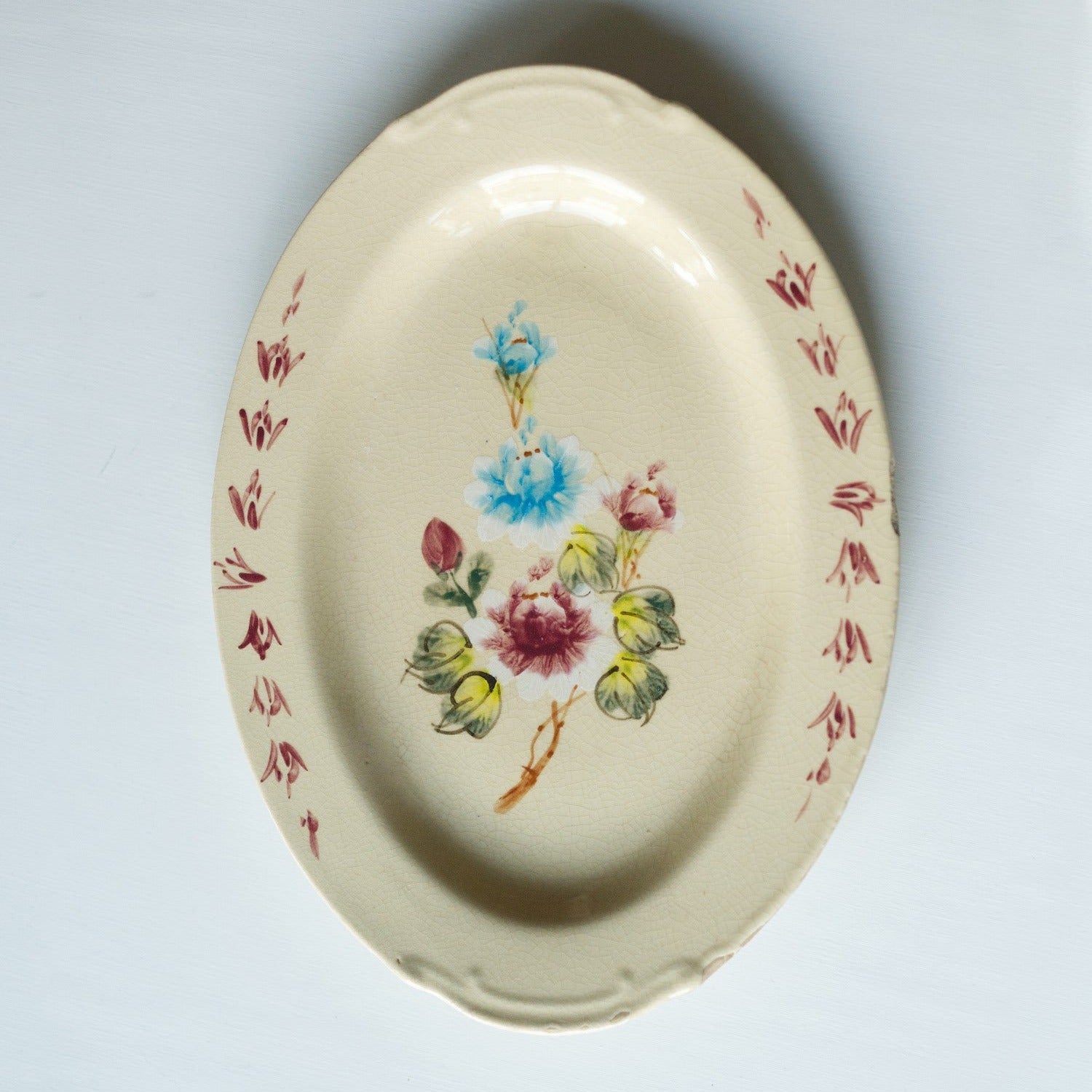 Oval plate. A piece with a hand-drawn small floral pattern and a calm color scheme.
