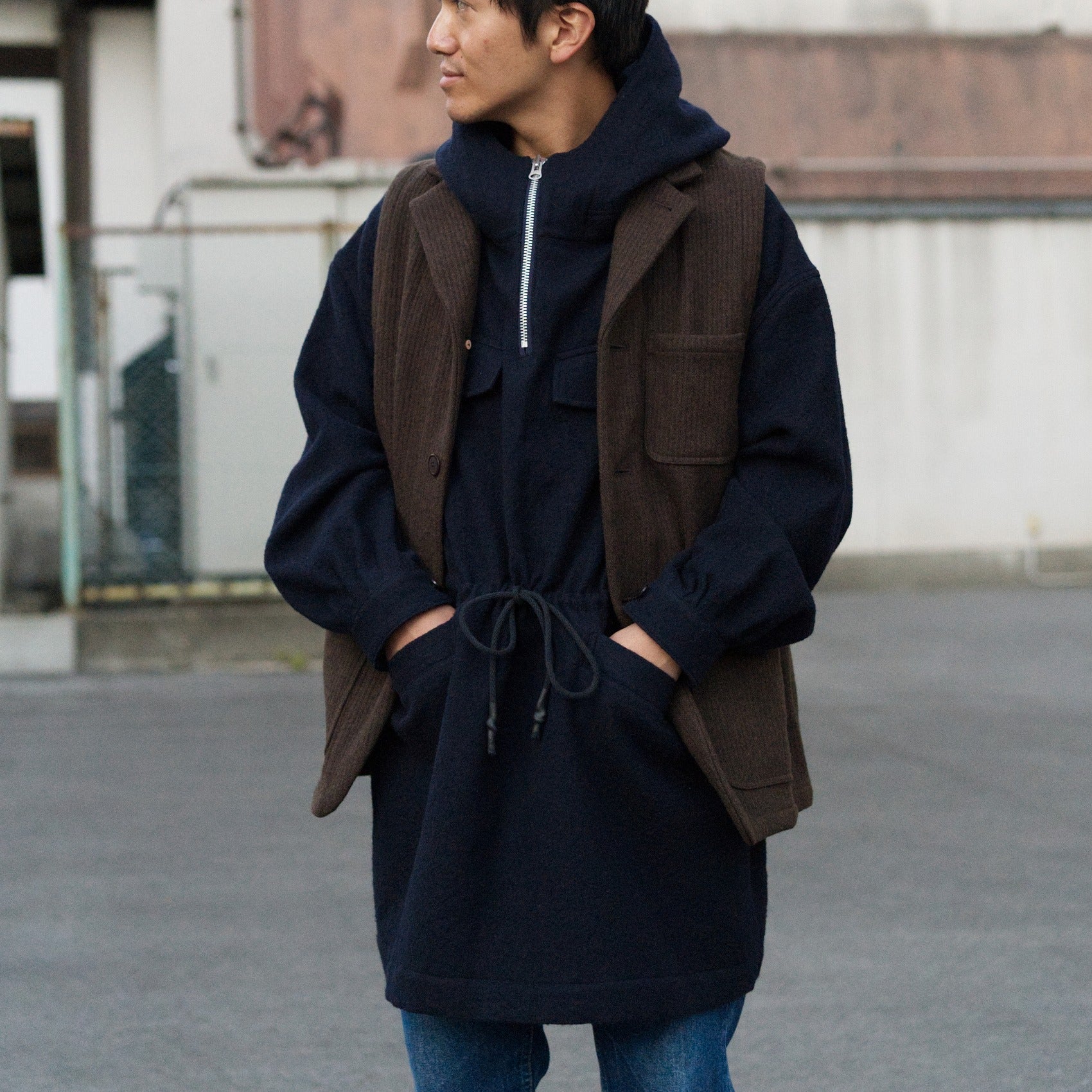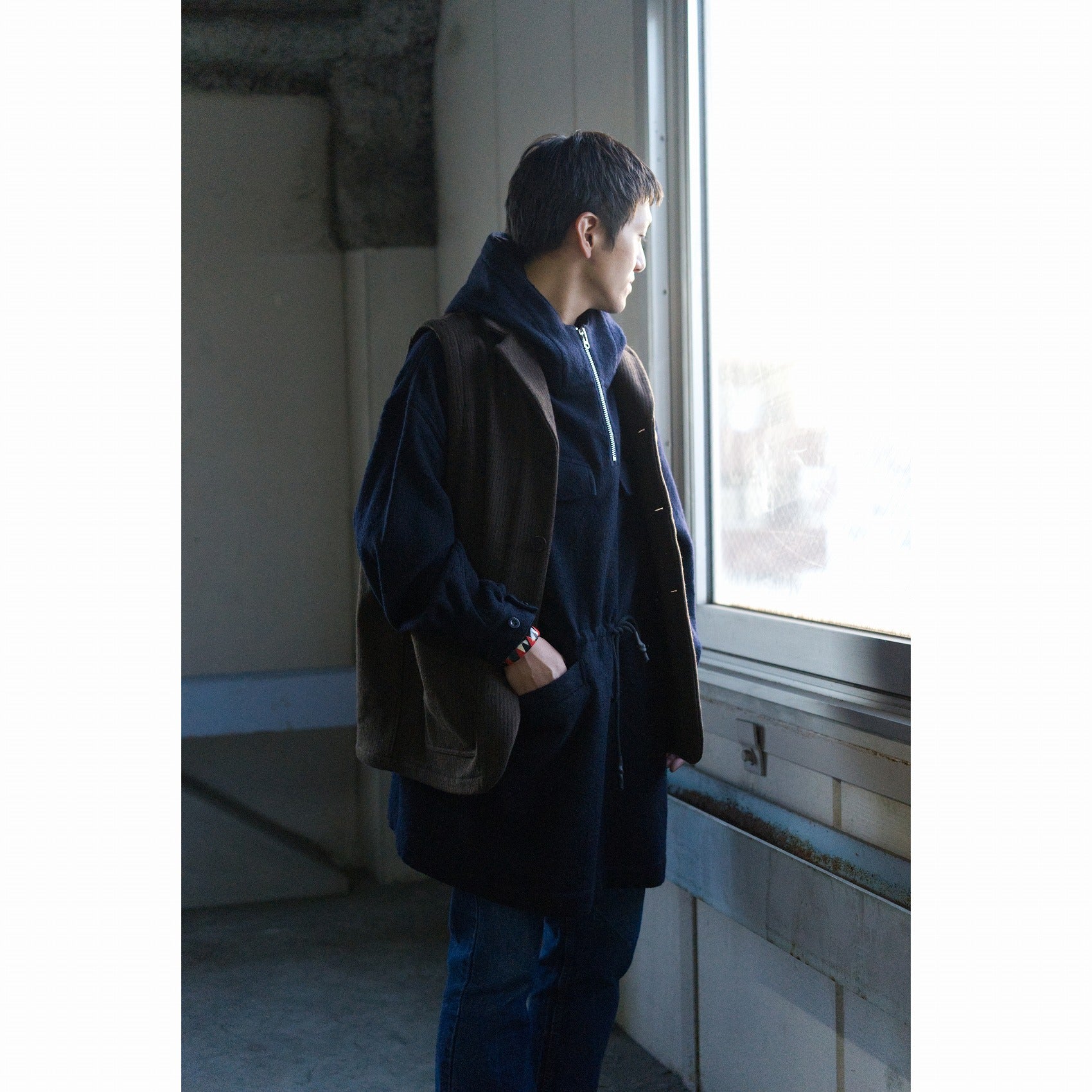 60年代のフランス軍山岳部隊のアルペンスモックパーカをベースに着脱も含めジップ仕様にして、裾ポケットは袋布を起毛素材にしてハンドウォーマーに。