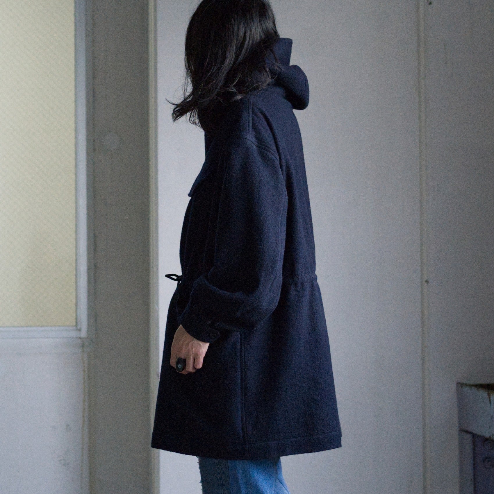 少しカッチリした雰囲気を出すために、フードの座りをよくするために少し高めの襟腰をがつけられています。