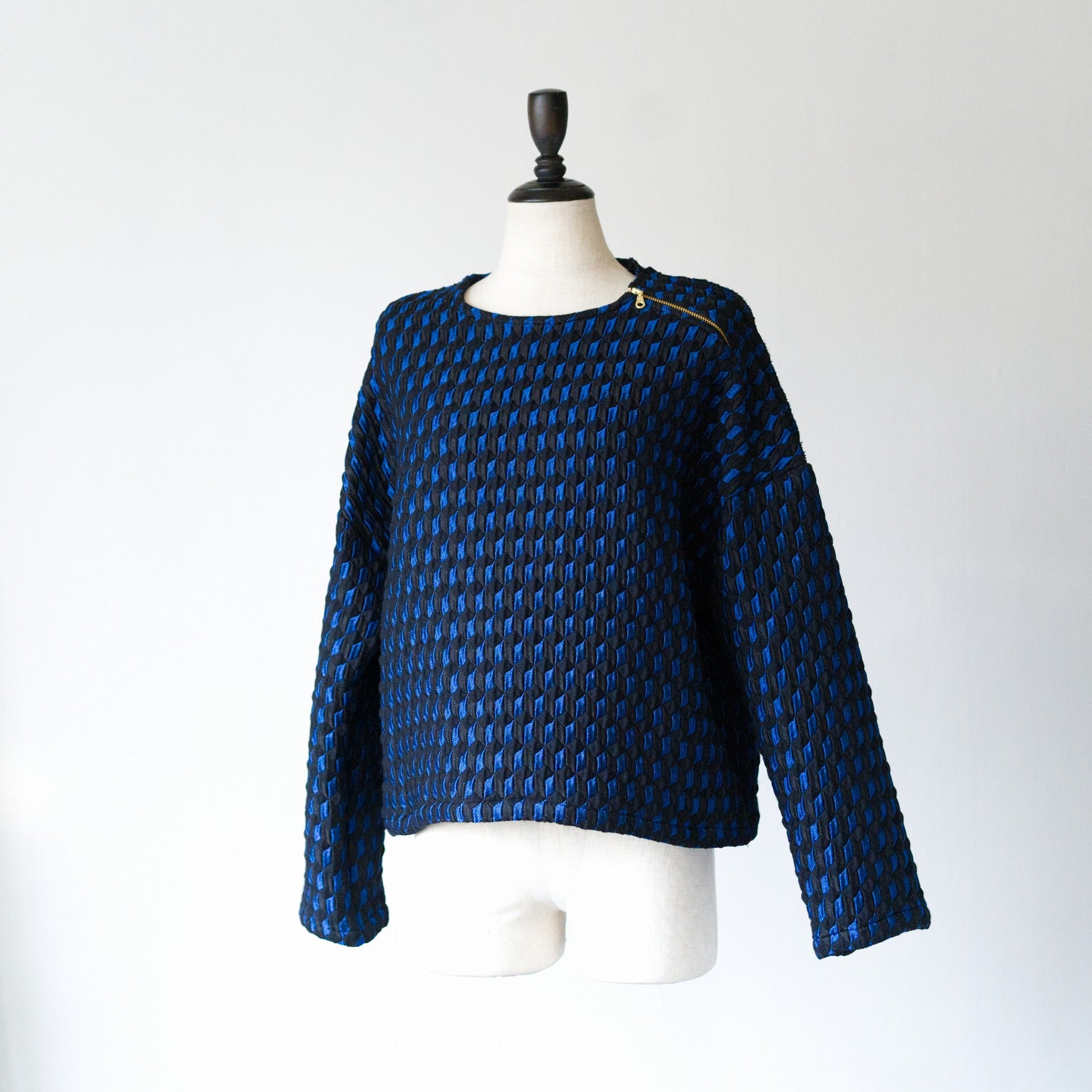 ボリューム感のある生地とミニマルなサイズ感がバランスがとてもかわいい一枚。 肩のジップをあけて被って着て頂けます。