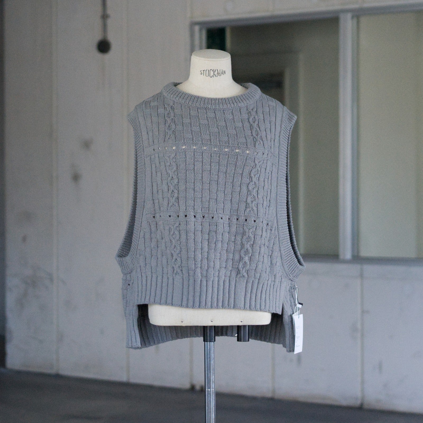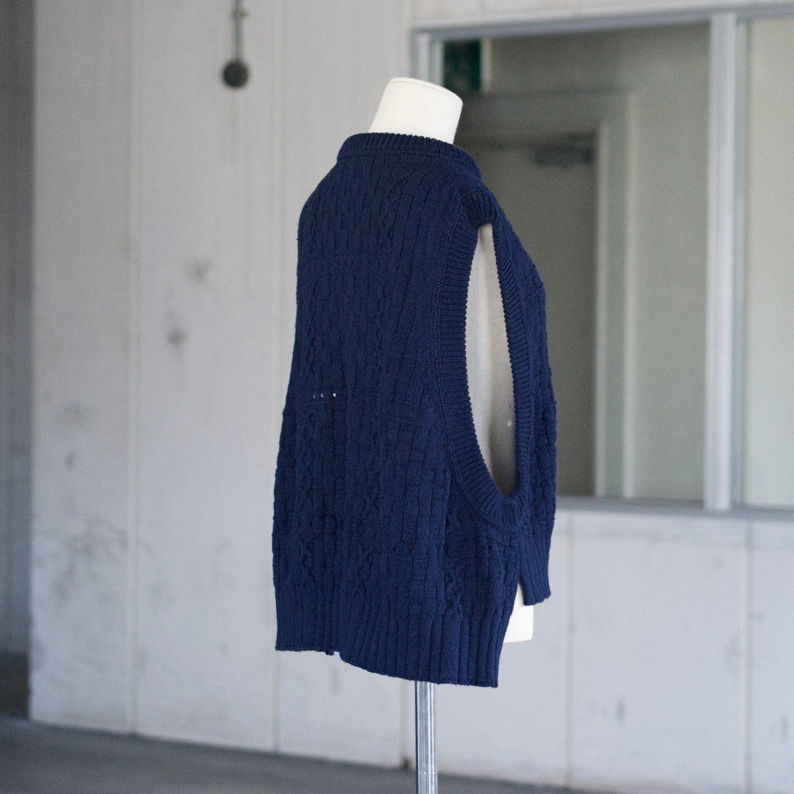 大きなアームホールで、どんなインナーとも合わせやすい形です。裾のシルエットがきれいに出るように、脇線を前に持ってきて前後差のあるデザインです。