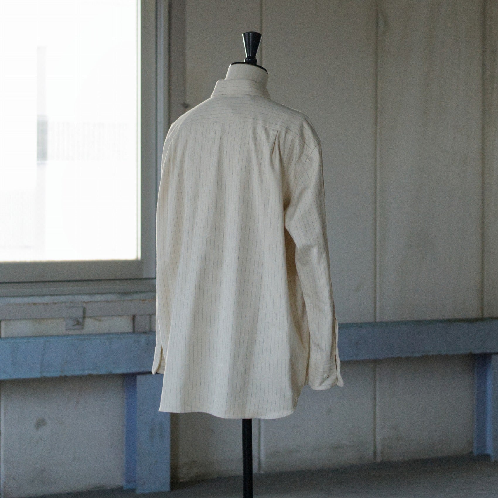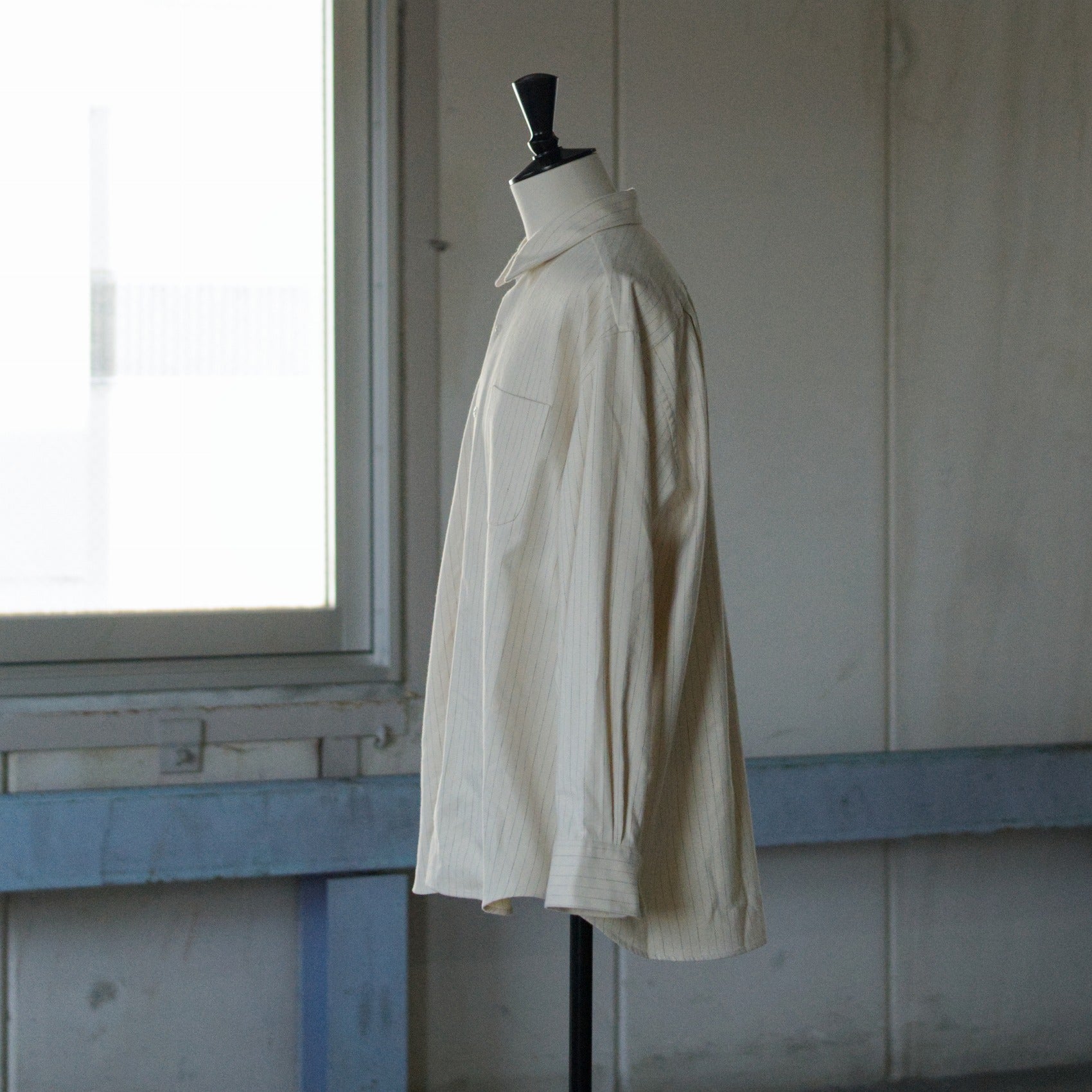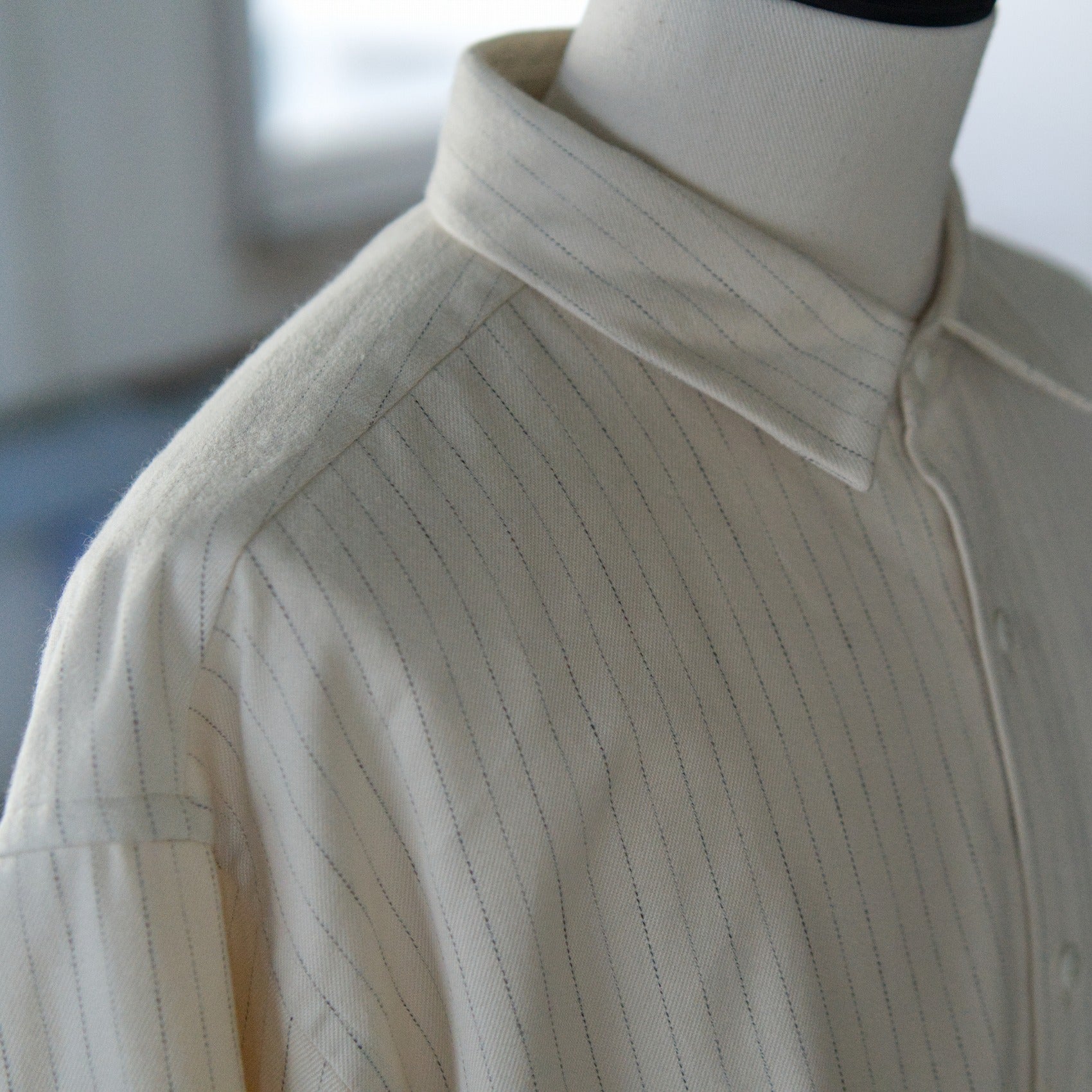 ドレスシャツらしい上品なパターンメイキングで有りながら、程よくドロップしたショルダーライン、ゆったりと広い身幅、力の抜けたルーズなサイズ感が特徴です。