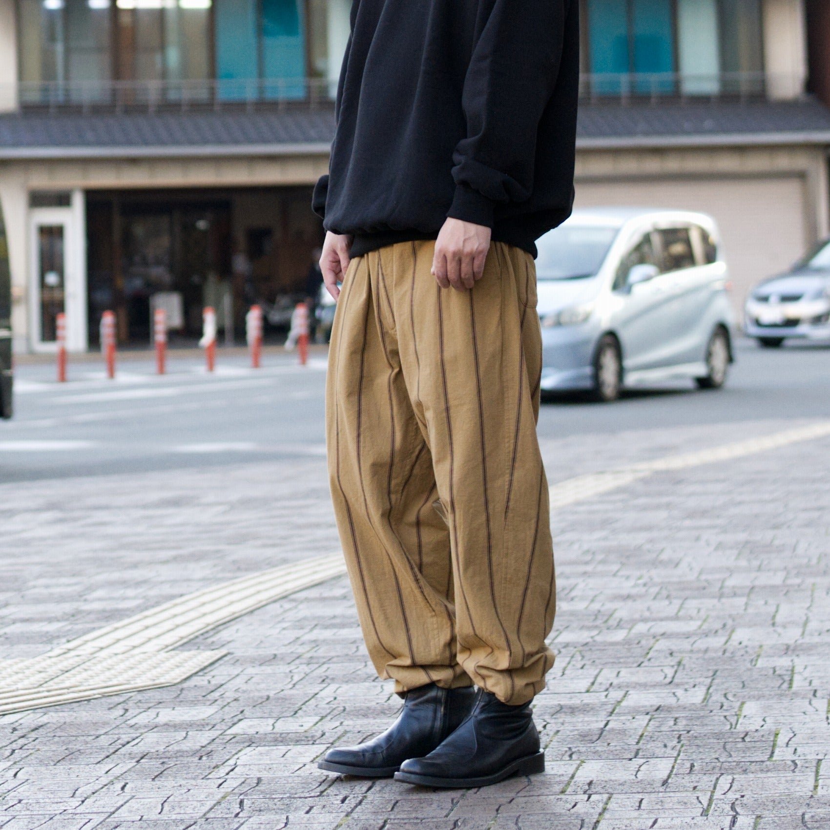 Tapered easy pants with no tucks and elastic around the waist, luxuriously made with a special original textile material.