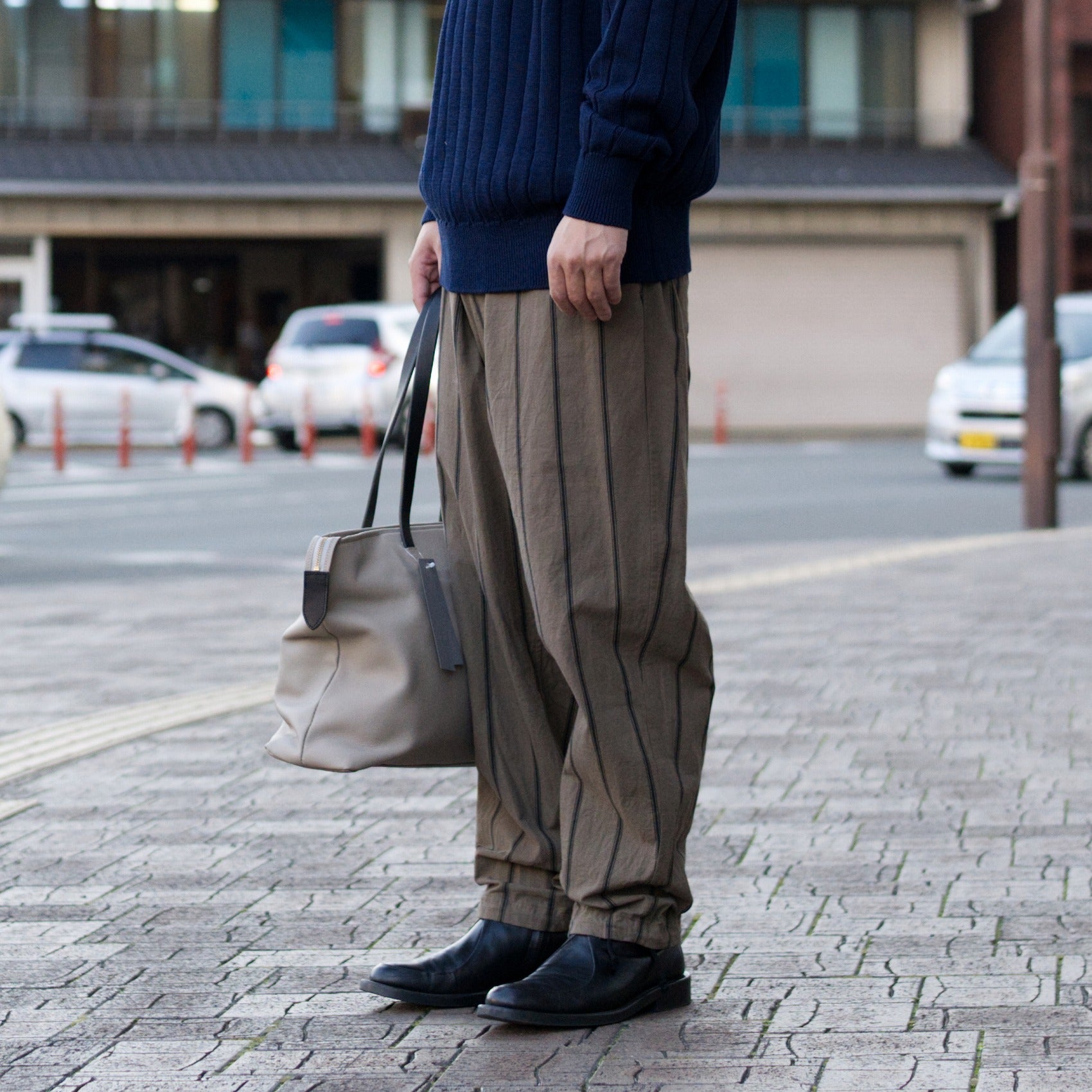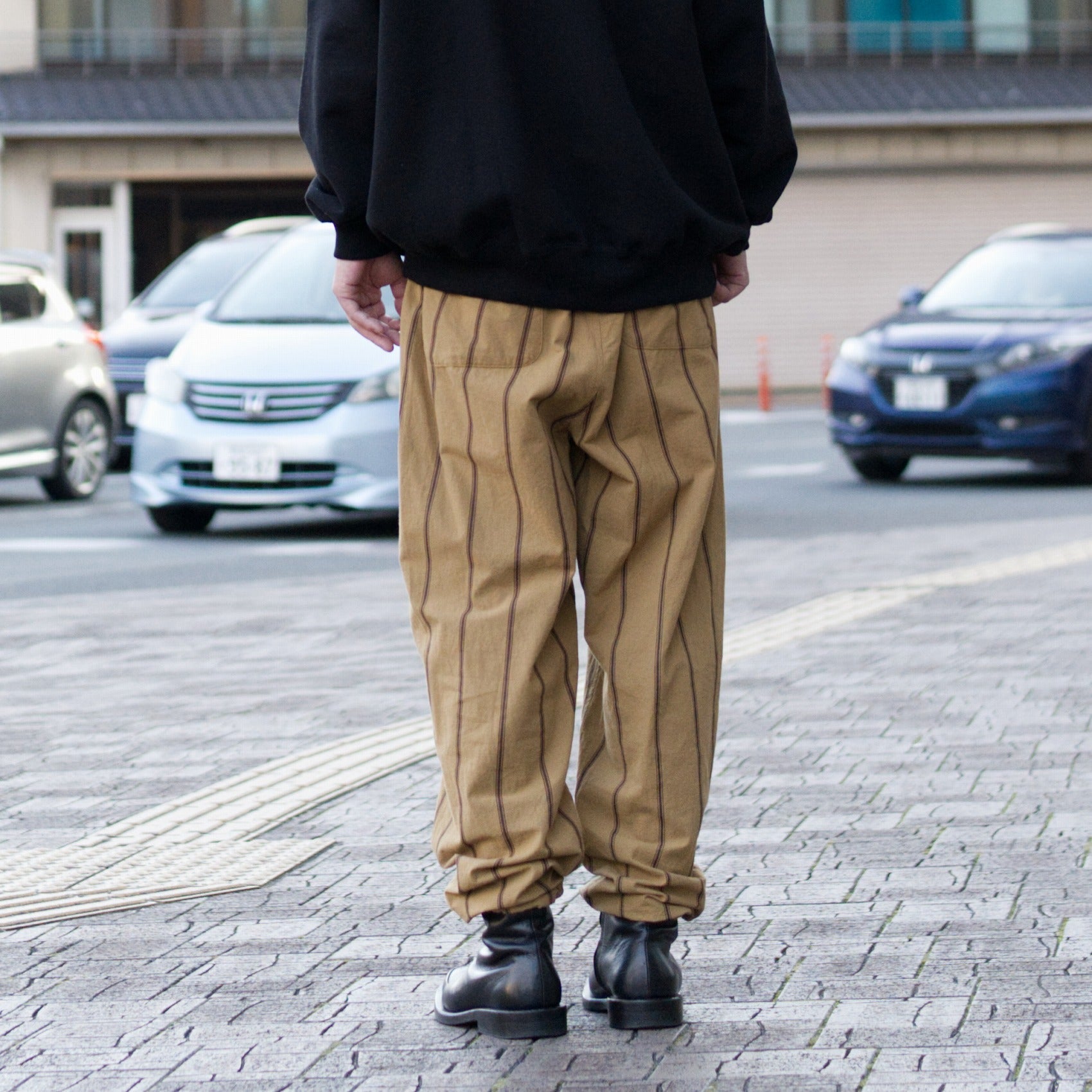 Each piece of fabric is hand-printed with persimmon tannin stripes and ink stripes using persimmon tannin and Bincho charcoal by skilled craftsmen in Kyoto.