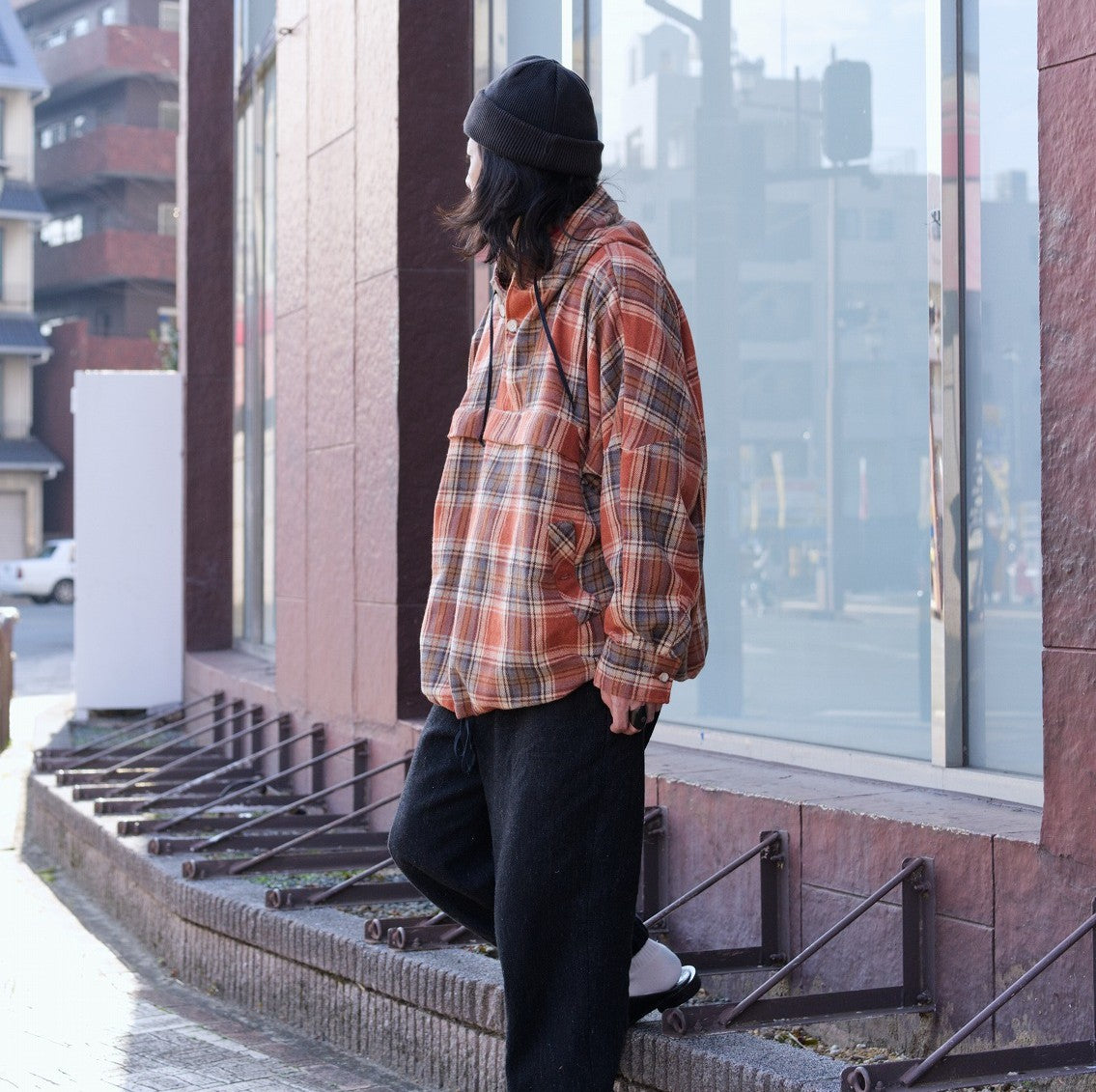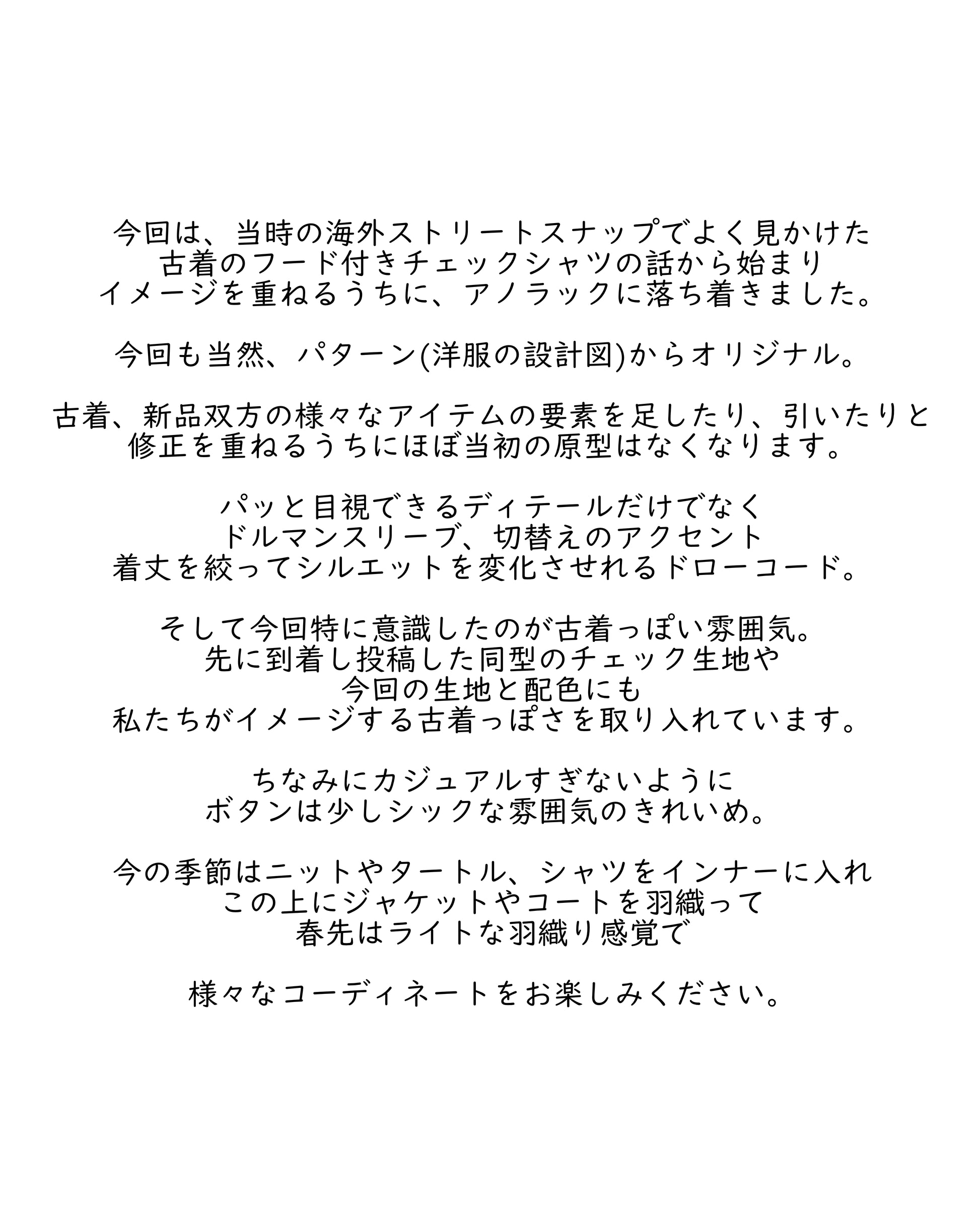 身幅を広めにとったアウターにでも、コートの中にも着て頂けるようなアノラックを目指し、制作しました。