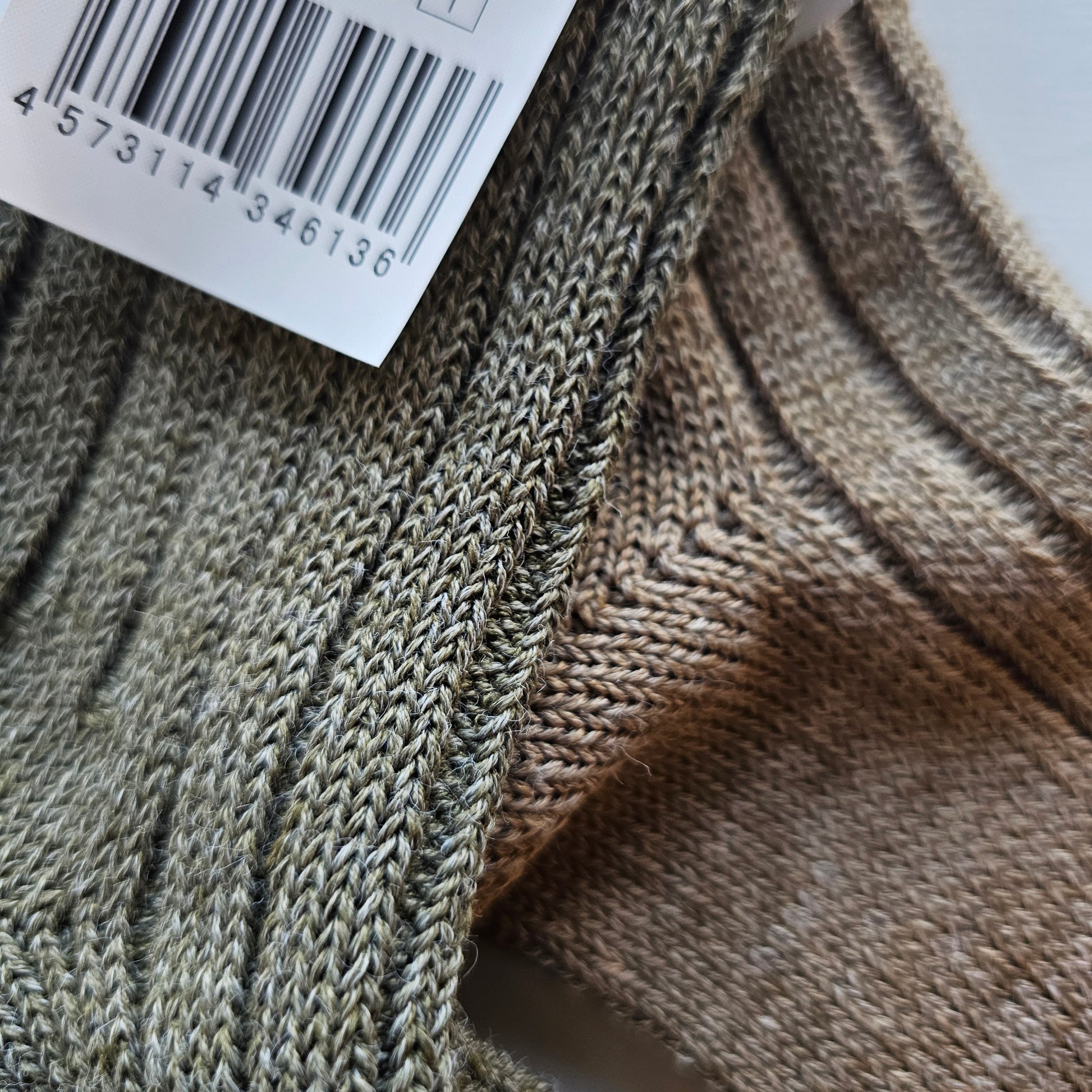 ヨーロッパのリネンに再生ポリエステルを混紡した糸で編み立てた。リサイクルという表面的な概念だけではなく、異なる素材が相互的にデメリットを補完し合っているという美しさを持った靴下。