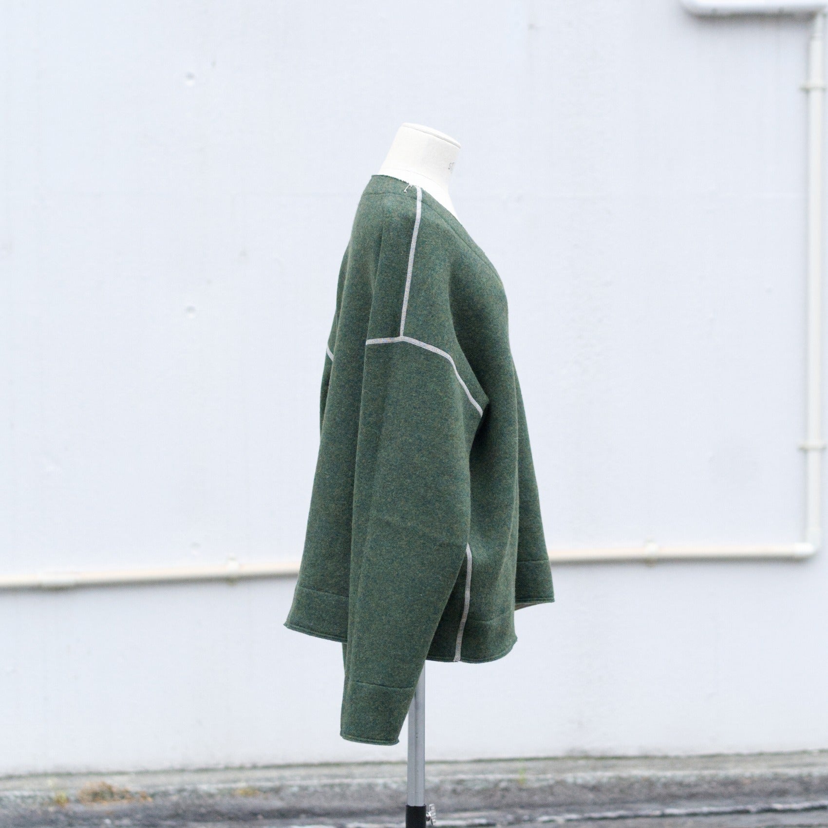 ローゲージの編機で天竺を貼り合わせるようにナイロンでつないでいる為、リバーシブルな生地になっています。